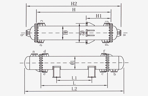管口用(yòng)途:a:管程入口或出口、b:管程入口或出口、c:冷卻水入口、d:冷卻水出口、e:清洗排盡口、f:備用(yòng)口。 |